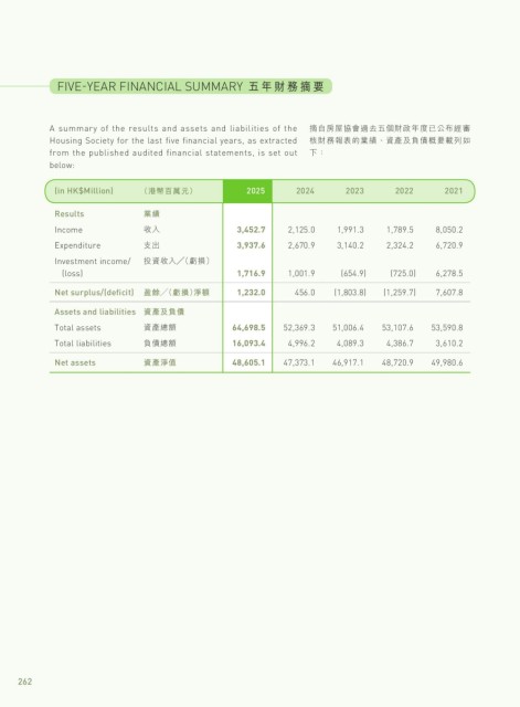 Housing Society for the last five financial years, as extracted 核財務報表的業績、資產及負債概要載列如