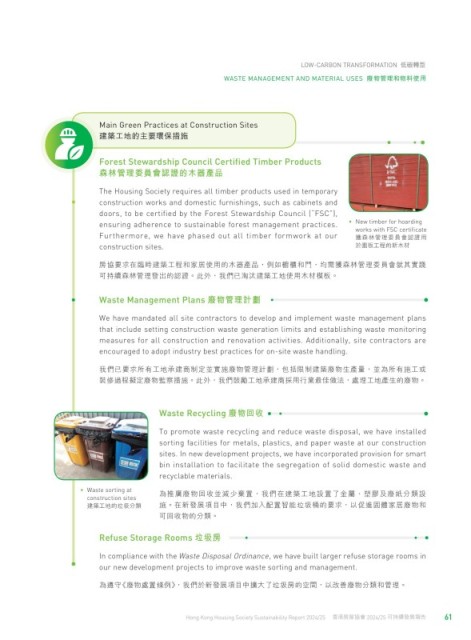 可持續森林管理發出的認證。此外,我們已淘汰建築工地使用木材模板。